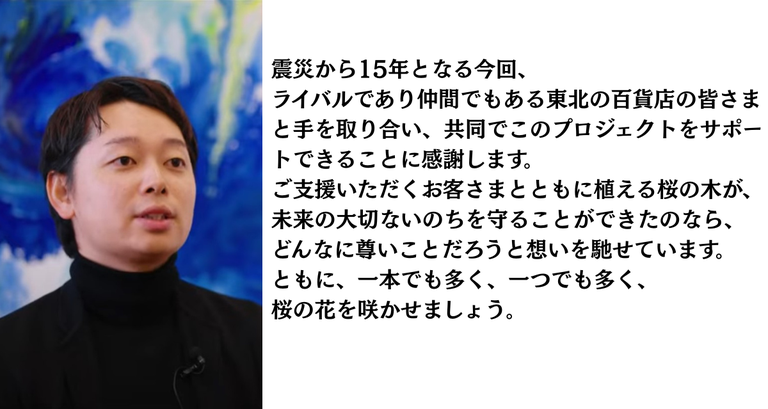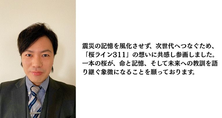 東日本大震災の津波最大到達地点を、桜並木という形で可視化する活動を続けています。石碑に刻まれてきた教訓を、次の世代にも自然と伝わる“生きた風景”として残すこと。毎年咲く桜が、静かに、しかし確かに、命を守るサインとなることを願っています。